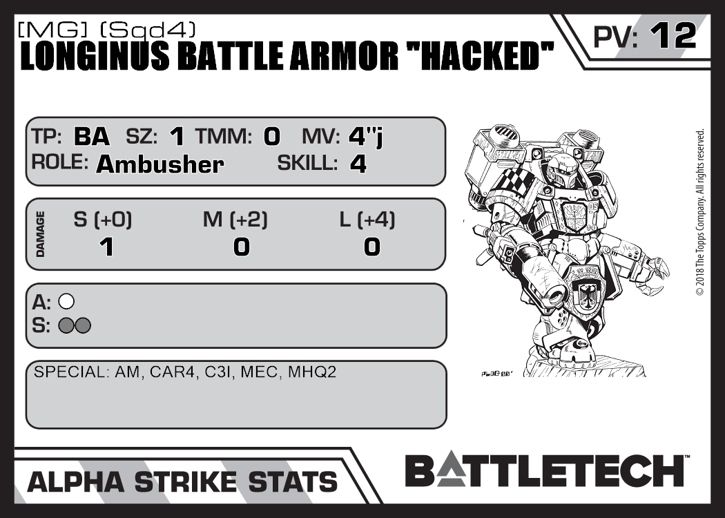 | Longinus Battle Armor "Hacked" [MG] (Sqd6) | 231 | 13 | Experimental | XTR:Marik |