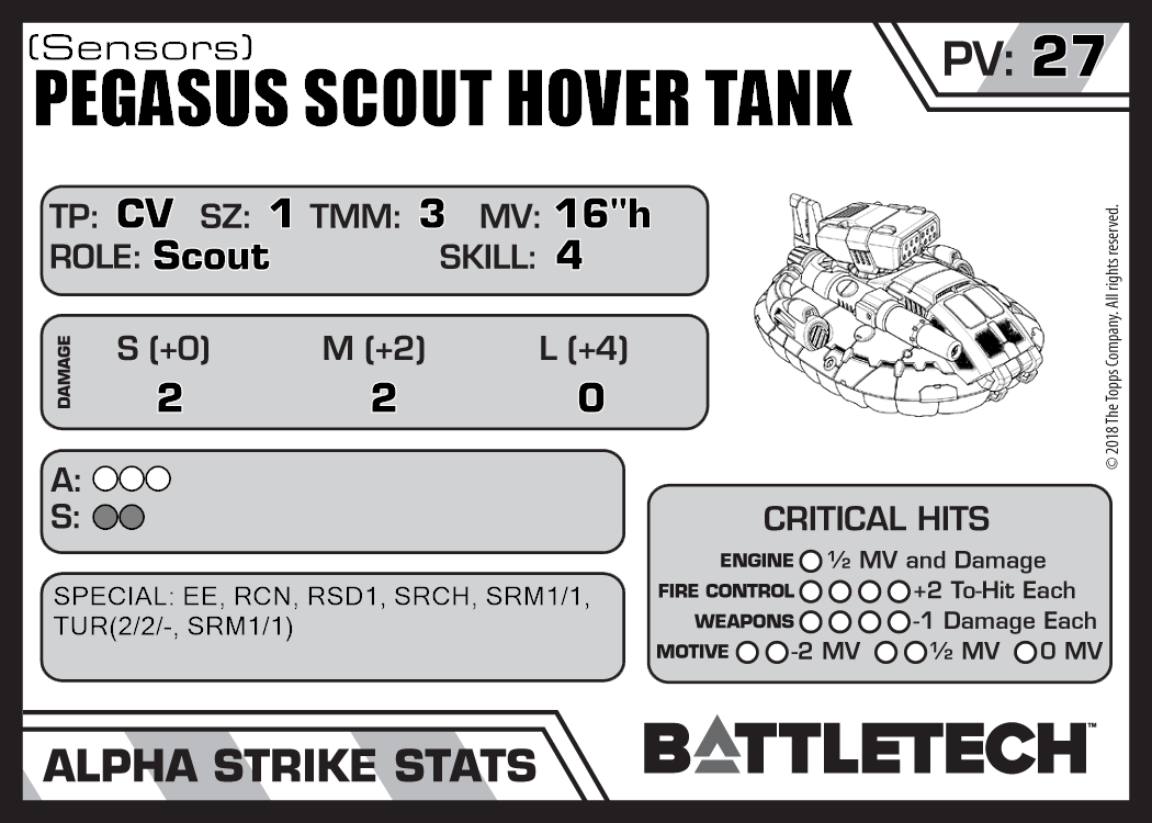 | Pegasus Scout Hover Tank (3058 Upgrade) | 706 | 30 | Standard | TR:3058U | |