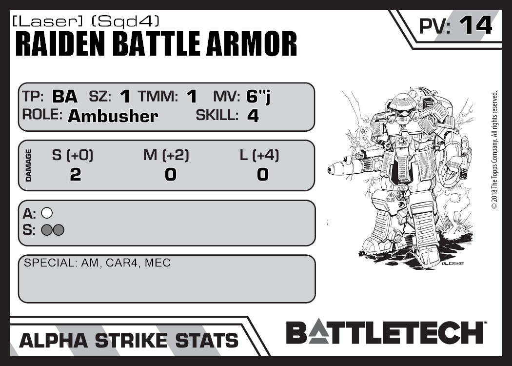| Raiden Battle Armor [Laser] (Sqd6) | 400 | 17 | Standard | TR:3058U | |