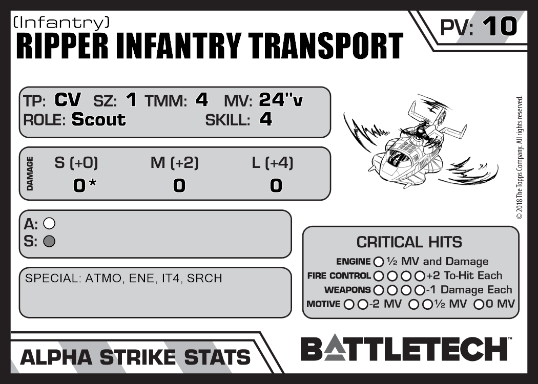 | Ripper Infantry Transport | 345 | 15 | Standard | TR:3050U |