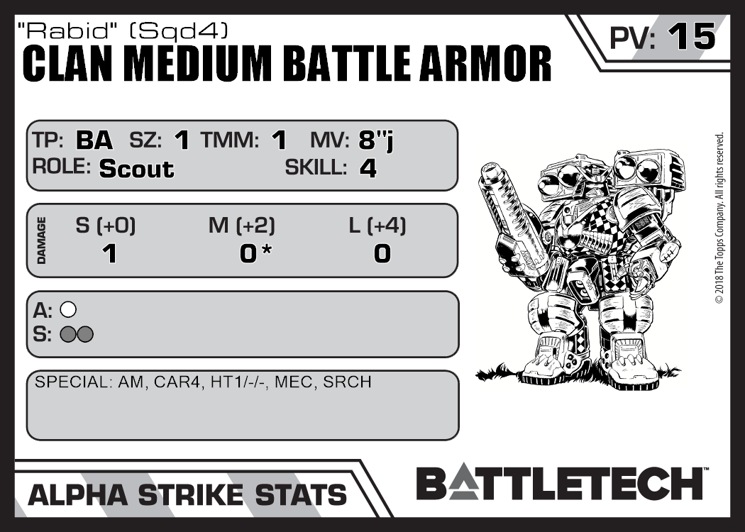 | Clan Medium Battle Armor "Rabid" (Sqd5) | 325 | 19 | Standard | TR:3075 | |