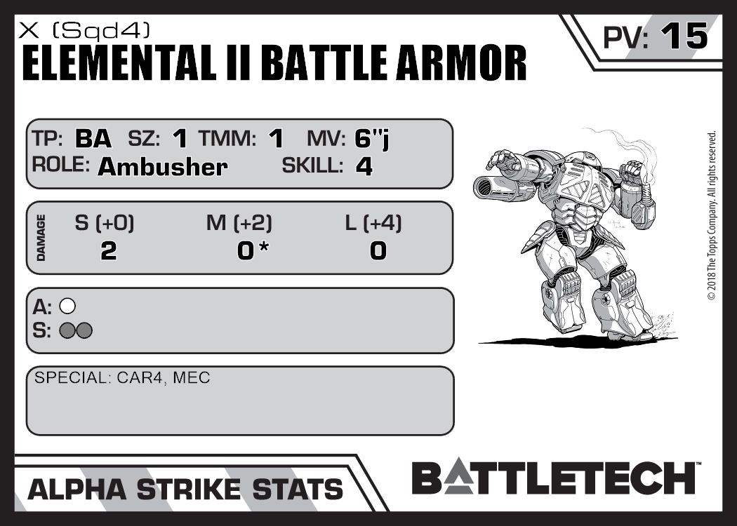 | Elemental II Battle Armor X (Sqd6) | 399 | 19 | Experimental | XTR:Clans | |