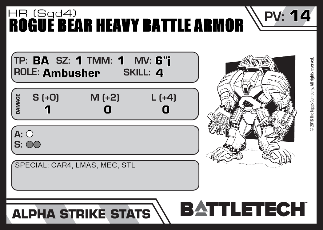 | Rogue Bear Heavy Battle Armor HR (Sqd6) | 432 | 19 | Experimental | XTR:Clans | |