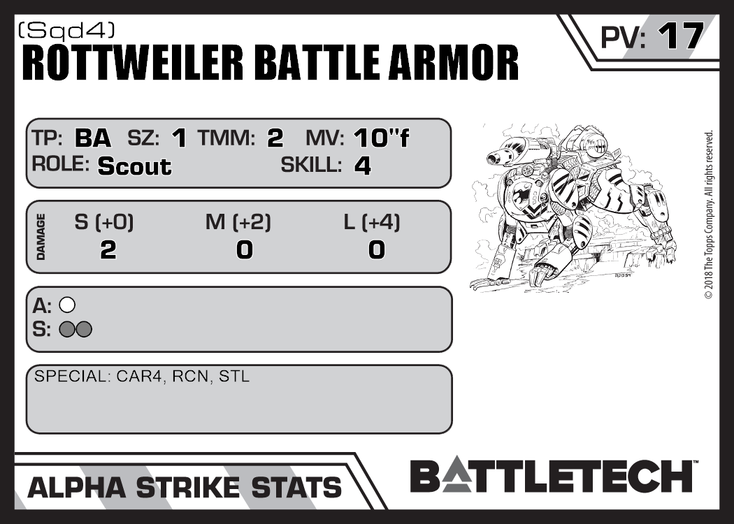 | Rottweiler Battle Armor (Close Combat) (Sqd4) | 204 | 18 | Standard | TR:3075 | |