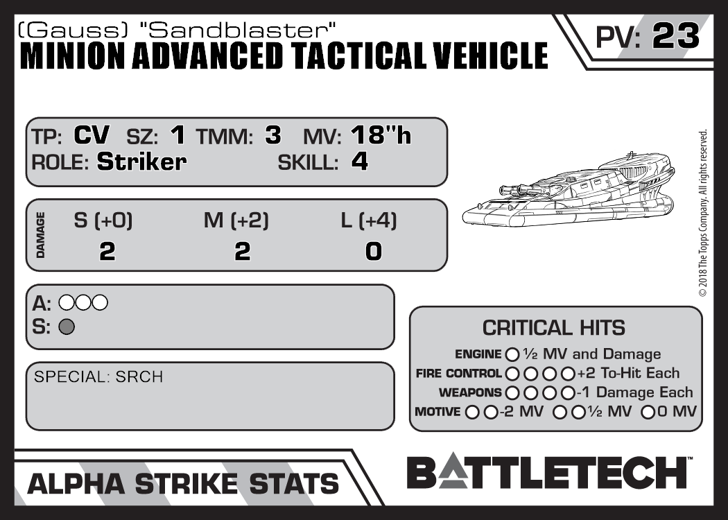 | Minion Advanced Tactical Vehicle (Targeting Computer) | 508 | 23 | Standard | TR:3067 |