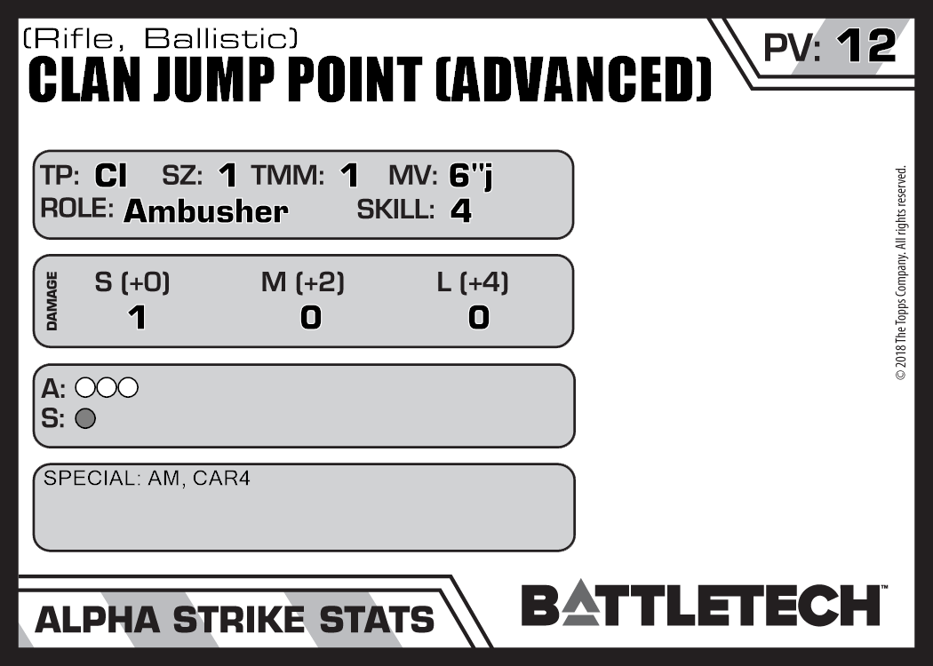 | Clan Jump Point (Advanced) (LRM) | 95 | 11 | Advanced | TO:AUE | |