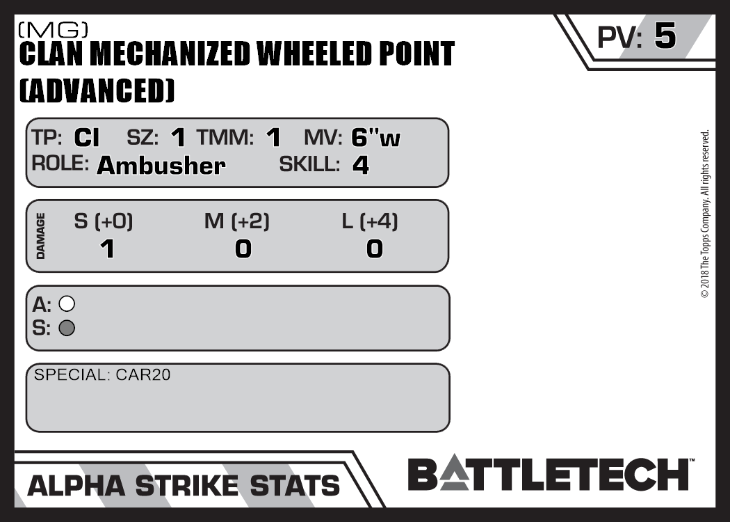 | Clan Mechanized Wheeled Point (Advanced) (Rifle, Ballistic) | 75 | 5 | Advanced | TO:AUE | |