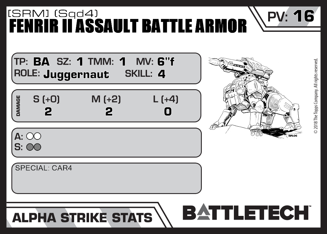 | Fenrir II Assault Battle Armor [SRM] (Sqd6) | 808 | 22 | Advanced | TR:3150 | |