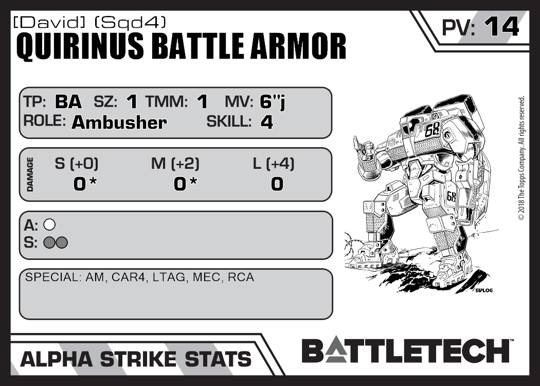 | Quirinus Battle Armor [David] (Sqd6) | 443 | 18 | Advanced | TR:3145 | |