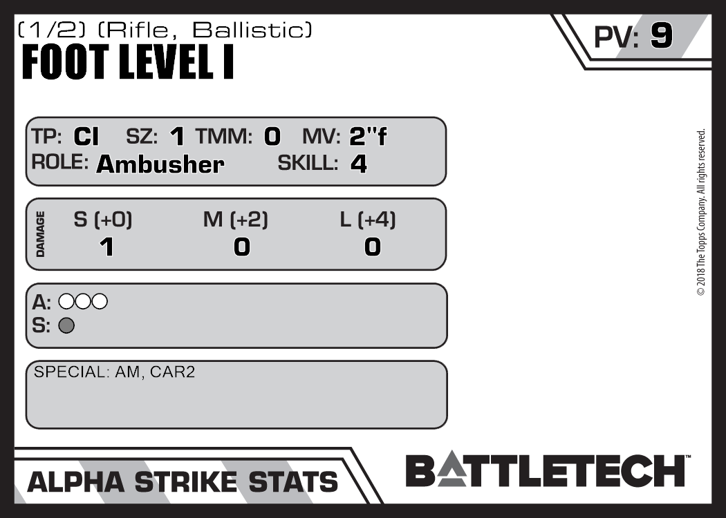 Two unit cards are needed to represent a single Level I (36 soldiers) of ComStar or Word of Blake foot infantry. The listed PV/BV is for a single card.