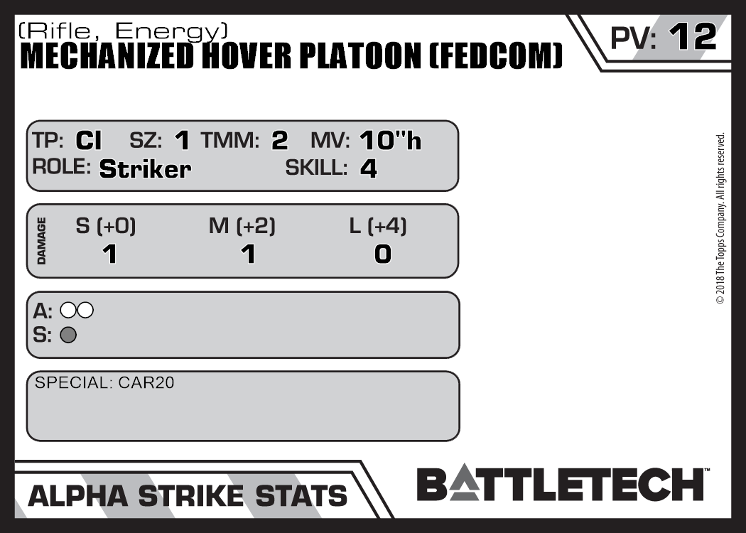 | Mechanized Hover Platoon (FedCom) (Rifle, Ballistic) | NA | 7 | Advanced | TO:AUE | |