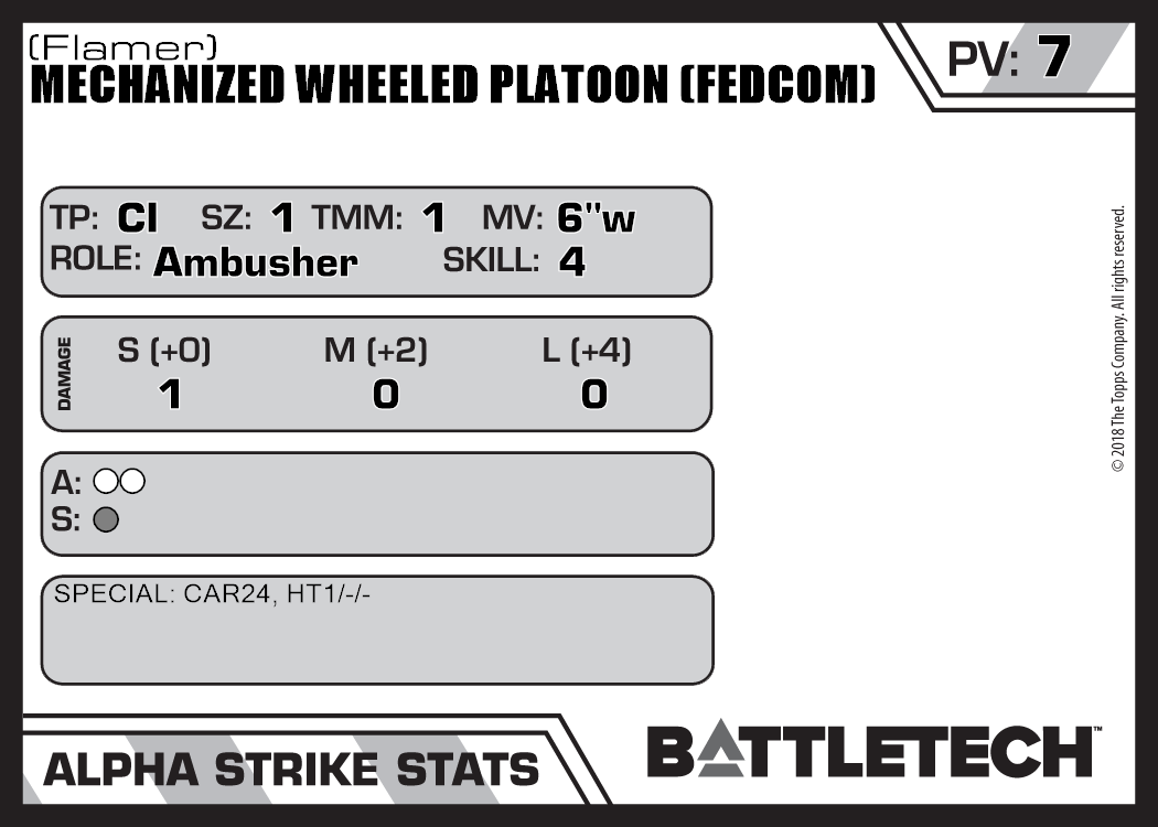 | Mechanized Wheeled Platoon (FedCom) (Rifle, Ballistic) | NA | 7 | Advanced | TO:AUE | |