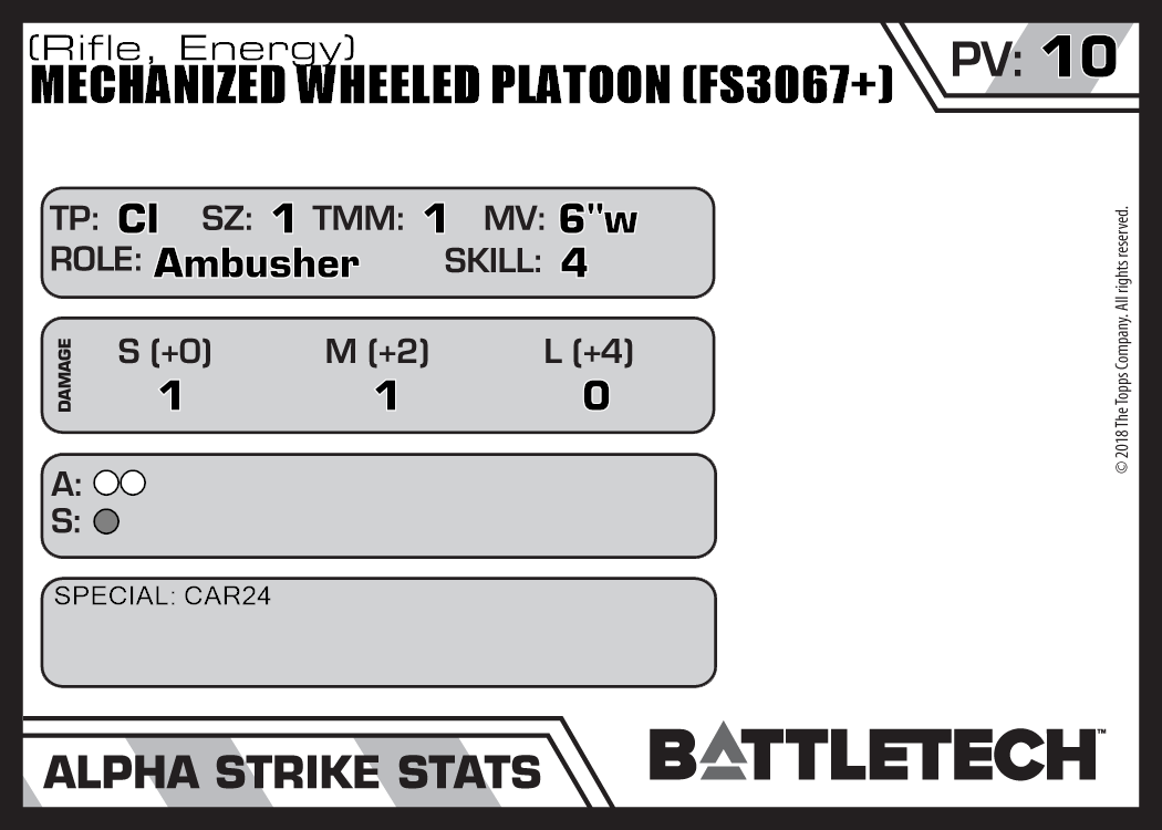 | Mechanized Wheeled Platoon (FS3067+) (Rifle, Ballistic) | NA | 6 | Advanced | TO:AUE | |