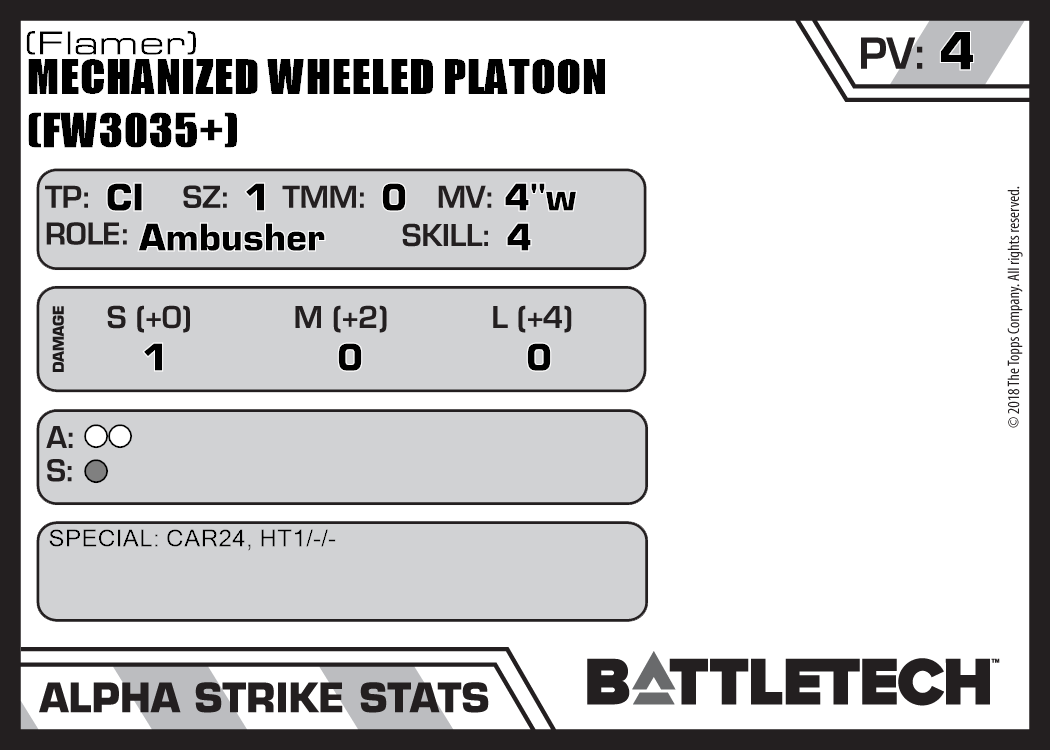 | Mechanized Wheeled Platoon (FW3035+) (Rifle, Energy) | NA | 10 | Advanced | TO:AUE | |