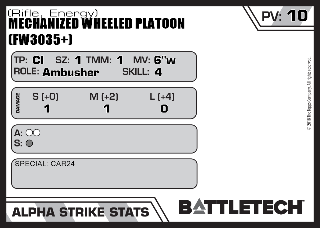 | Mechanized Wheeled Platoon (FW3035+) (Rifle, Ballistic) | NA | 6 | Advanced | TO:AUE | |