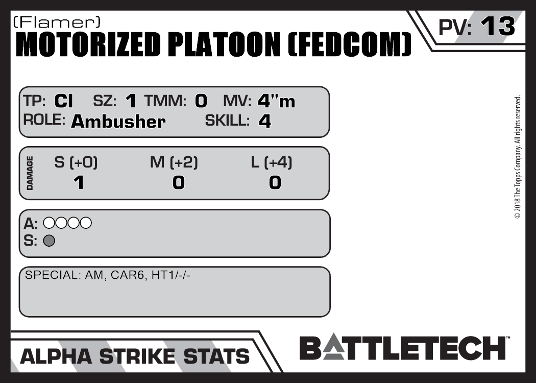 | Motorized Platoon (FedCom) (Rifle, Ballistic) | NA | 13 | Advanced | TO:AUE | |