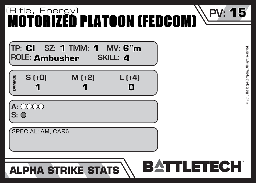 | Motorized Platoon (FedCom) (Rifle, Ballistic) | NA | 13 | Advanced | TO:AUE | |