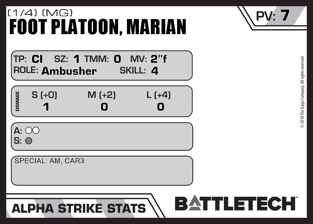| Foot Platoon, Marian (1/4) (Rifle, Ballistic) | NA | 7 | Standard | TW |