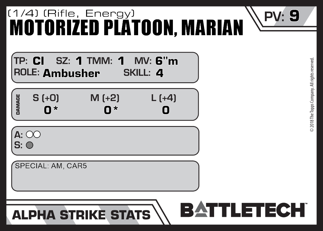 | Motorized Platoon, Marian (1/4) (Rifle, Ballistic) | NA | 8 | Standard | TW | |