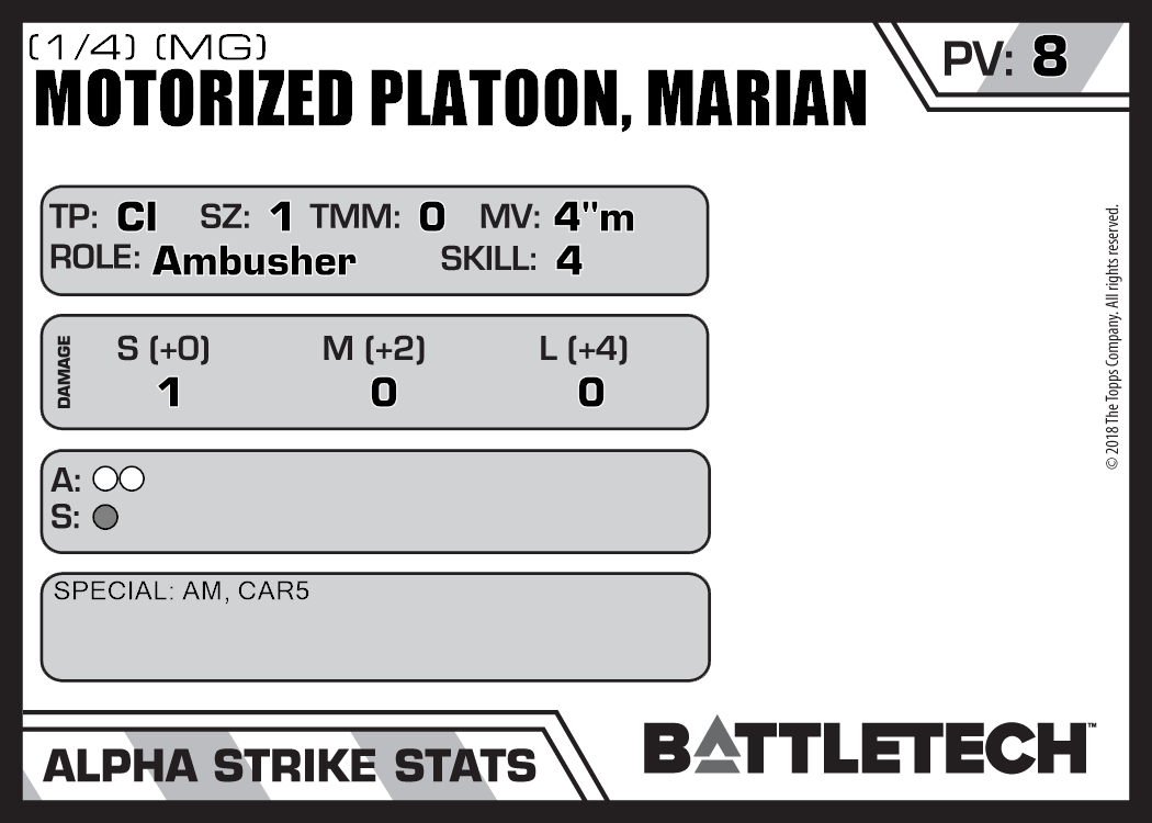 | Motorized Platoon, Marian (1/4) (Rifle, Ballistic) | NA | 8 | Standard | TW | |