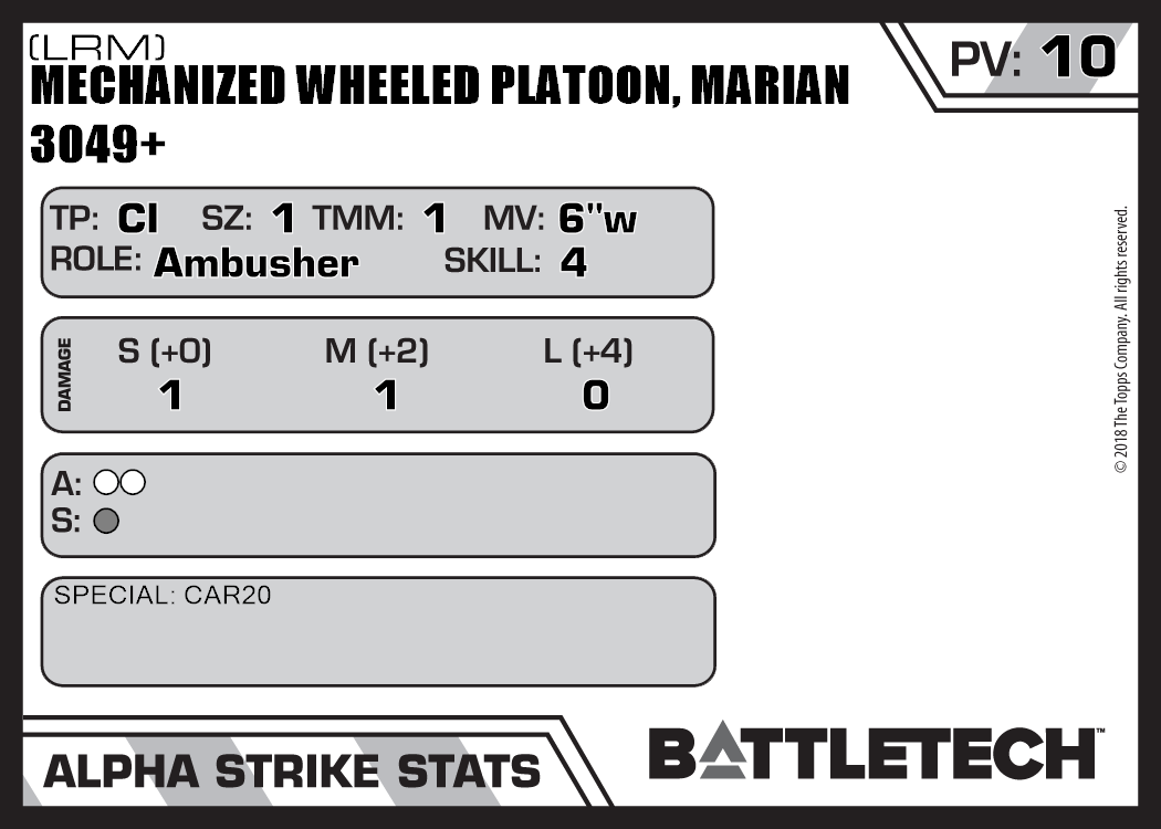 | Mechanized Wheeled Platoon, Marian 3049+ (Rifle, Ballistic) | NA | 7 | Advanced | TO:AUE | |
