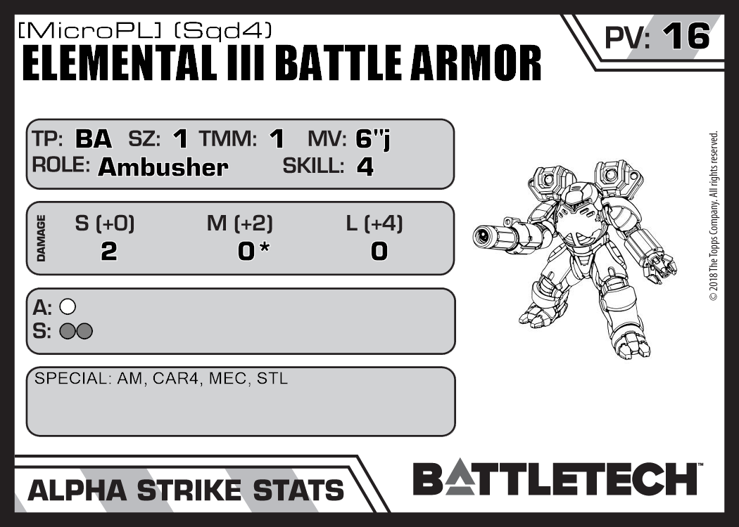 | Elemental III Battle Armor [MicroPL] (Sqd6) | 558 | 20 | Standard | RG24 |