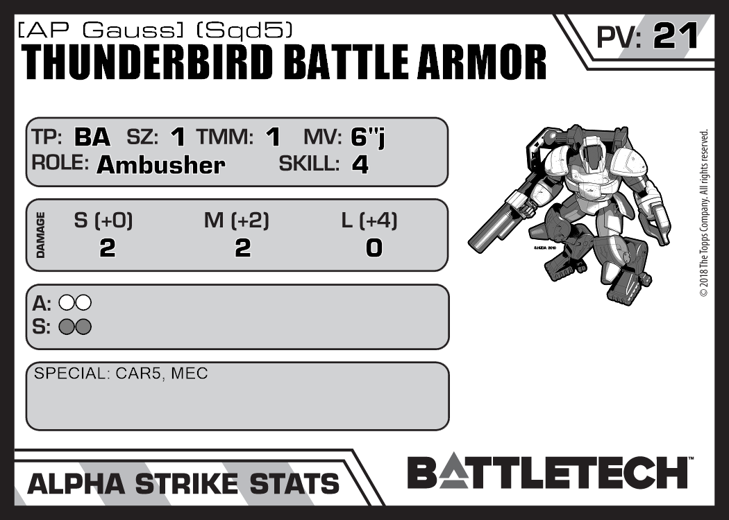 | Thunderbird Battle Armor [AP Gauss] (Sqd6) | 450 | 21 | Standard | TR:3085S | |