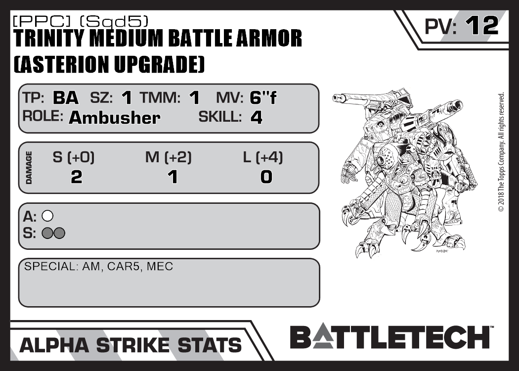 | Trinity Medium Battle Armor (Asterion Upgrade) [PPC] (Sqd6) | 400 | 14 | Standard | TR:3085 |