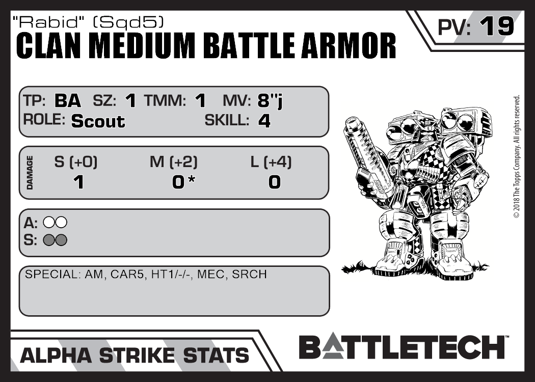 | Clan Medium Battle Armor "Rabid" (Sqd4) | 241 | 15 | Standard | TR:3075 | |