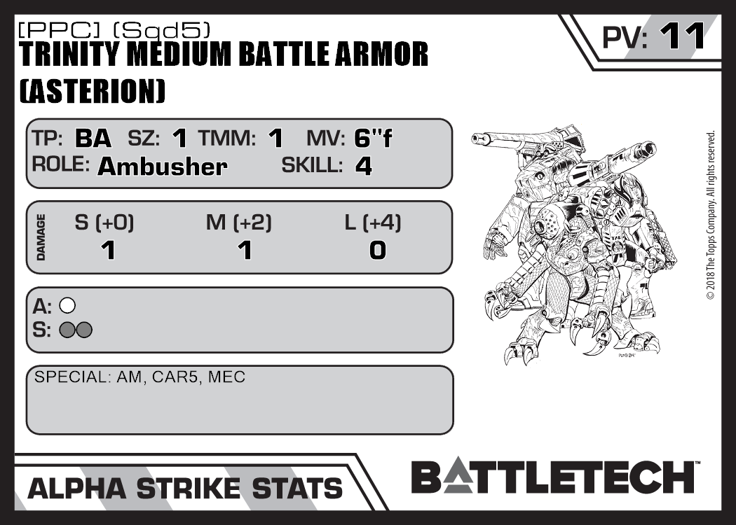 | Trinity Medium Battle Armor (Asterion) [PPC] (Sqd6) | 324 | 13 | Standard | TR:3075 |