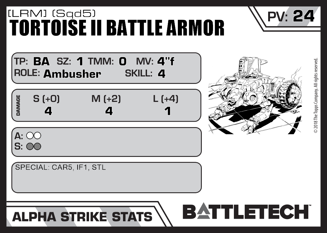 | Tortoise II Battle Armor [LRM] (Sqd4) | 745 | 22 | Advanced | XTR:RotS 2 | |