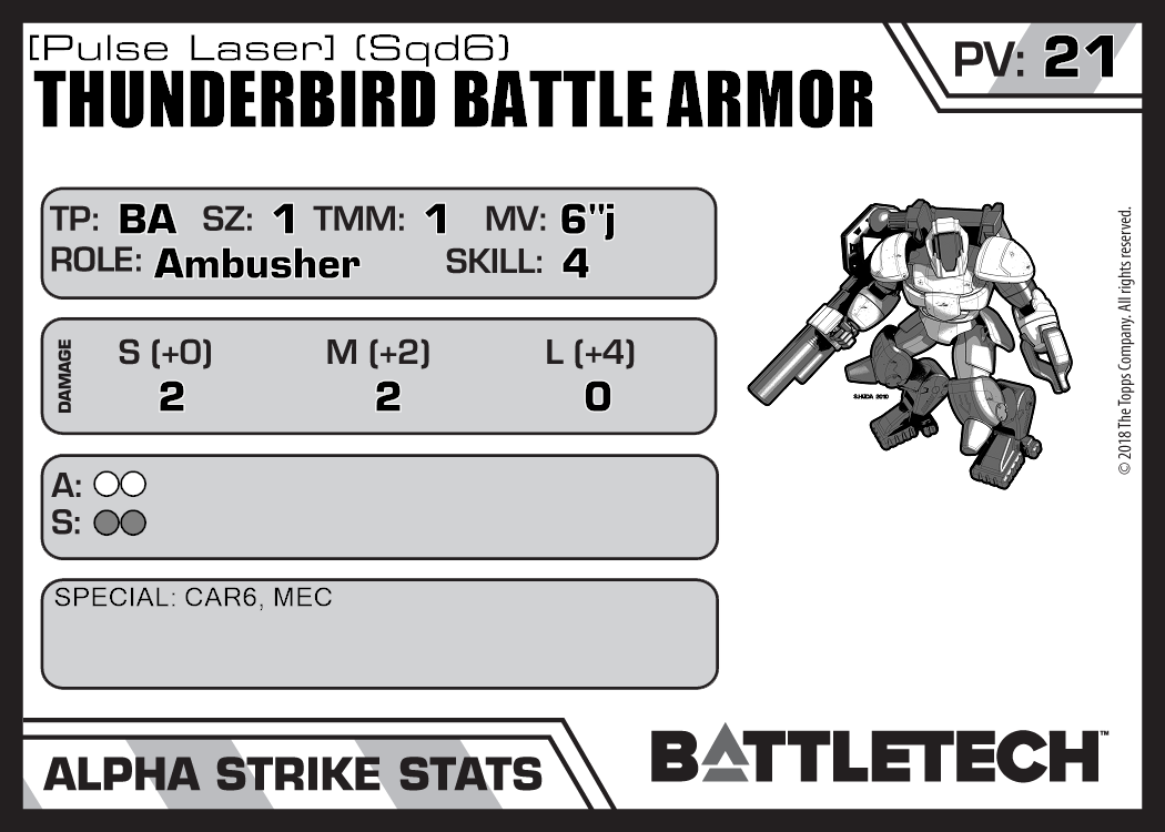 | Thunderbird Battle Armor [Pulse Laser] (Sqd4) | 272 | 18 | Standard | TR:3085S | |