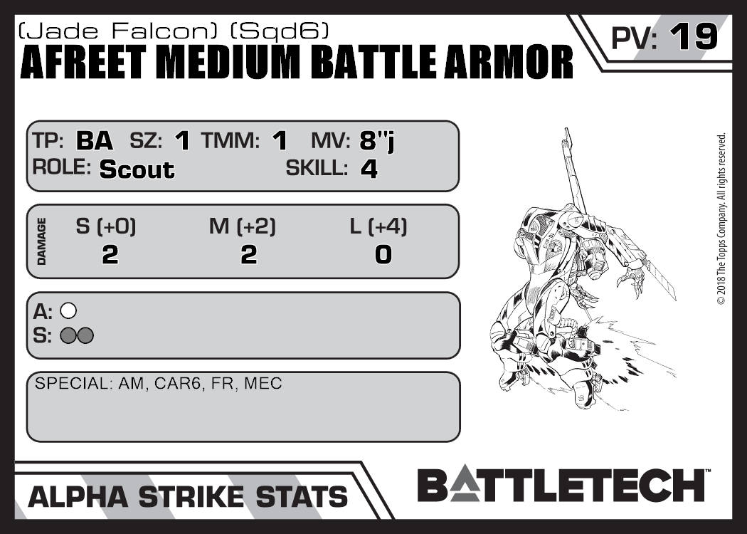 | Afreet Medium Battle Armor (Jade Falcon) (Sqd4) | 326 | 19 | Standard | TR:3075 | |