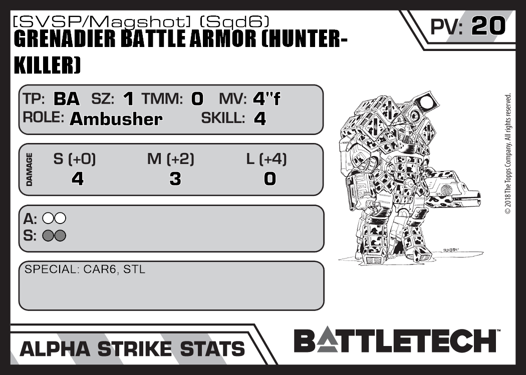 | Grenadier Battle Armor (Hunter-Killer) [SVSP/Magshot] (Sqd4) | 291 | 16 | Standard | None | |