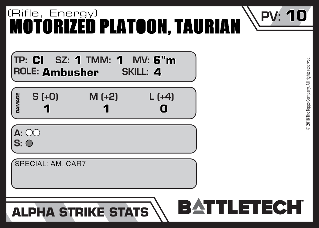 | Motorized Platoon, Taurian (Rifle, Ballistic) | 98 | 8 | Standard | TW | |