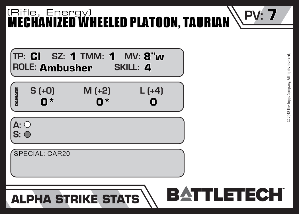| Mechanized Wheeled Platoon, Taurian (Rifle, Ballistic) | NA | 5 | Standard | TW | |