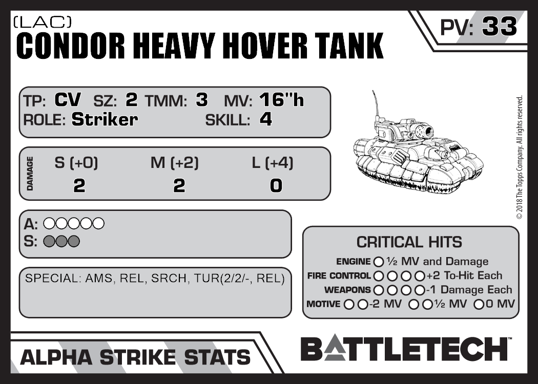 | Condor Heavy Hover Tank (Davion) | 592 | 23 | Introductory | TR:3039 | |