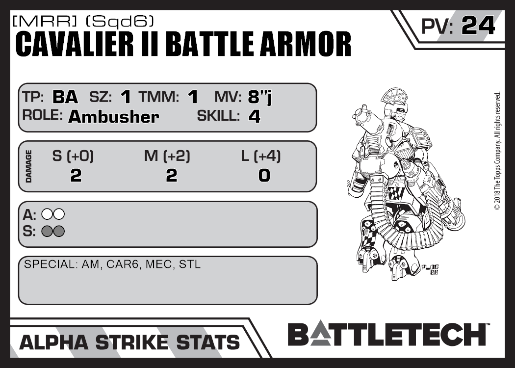 | Cavalier II Battle Armor [MRR] (Sqd5) | 481 | 24 | Standard | TR:3150 | |