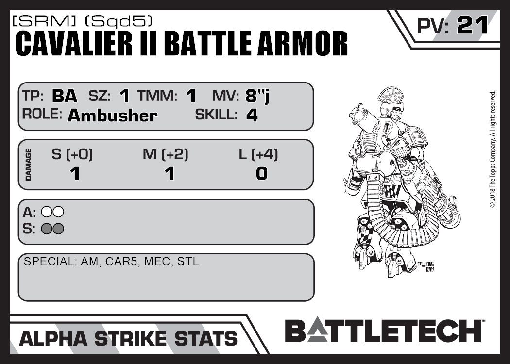 | Cavalier II Battle Armor [SRM] (Sqd6) | 436 | 21 | Standard | TR:3150 |