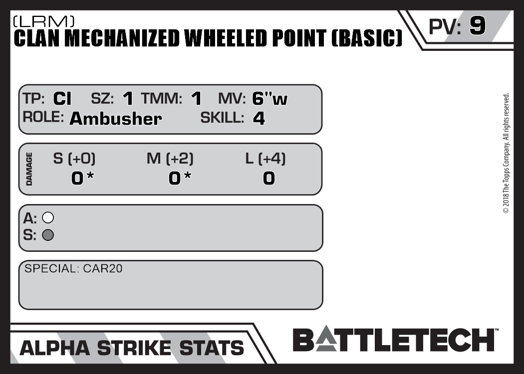 | Clan Mechanized Wheeled Point (Basic) (SRM) | 52 | 8 | Standard | TW |